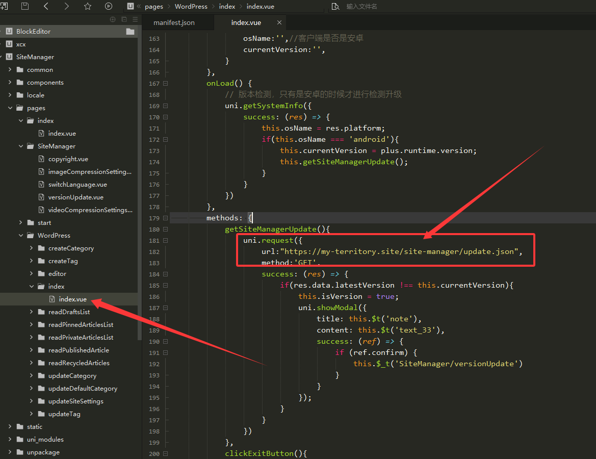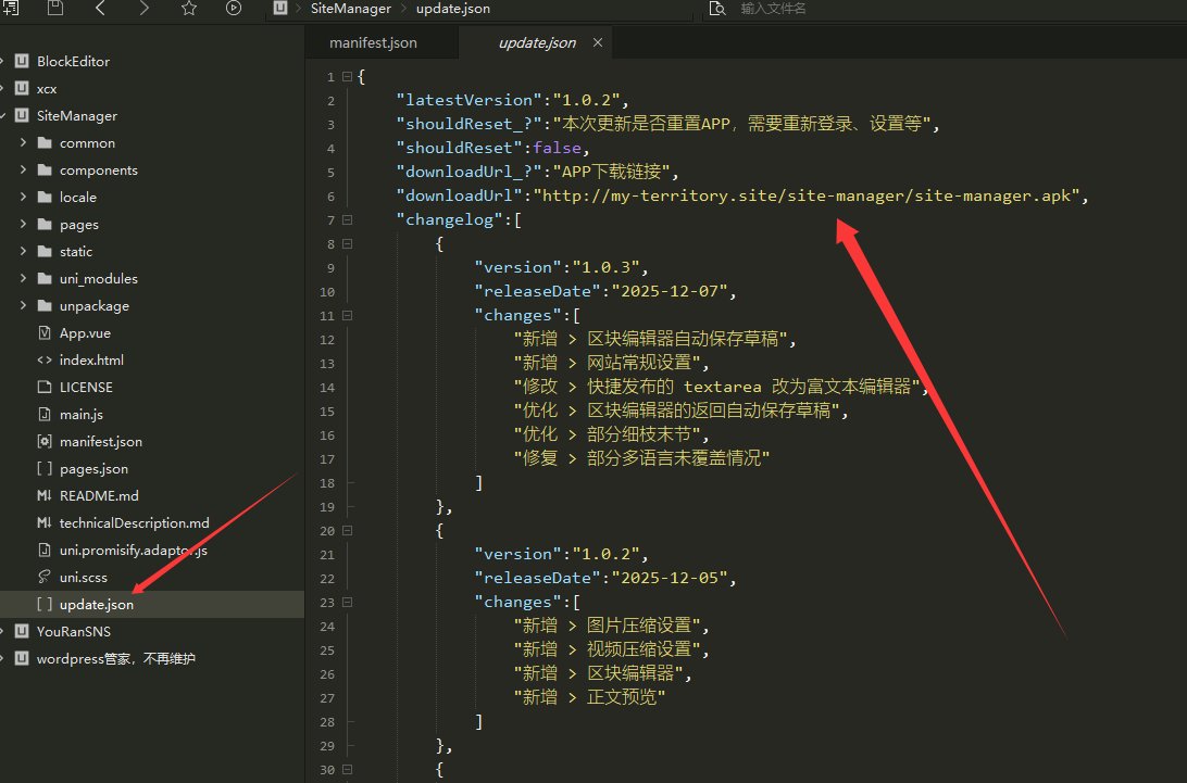 源码根目录的 update.json 文件是 APP 更新文件,需要放到服务器上边的,如下图: